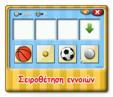 Θεματική Ενότητα: Προμαθηματικές έννοιες. Παιχνίδι με τις έννοιες: Μεγάλο–μικρό, ψηλό–χαμηλό, βαρύ-ελαφρύ, πλατύ-στενό, μακρύ-κοντό, χοντρό-λεπτό. Στο κάτω μέρος της οθόνης, εμφανίζονται 4 αντικείμενα που η διαφορά τους είναι το μέγεθος μιας από τις παραπάνω έννοιες. Ο μαθητής θα πρέπει να μετακινήσει τα αντικείμενα και να τοποθετήσει στη σειρά και στις εσοχές στο πάνω μέρος της οθόνης ανάλογα με το ηχητικό μήνυμα που περιγράφει τη διαφορά τους. Η εφαρμογή βρίσκεται σε αναμονή μέχρι ο μαθητής καταφέρει να τοποθετήσει όλα τα αντικείμενα στη σωστή σειρά. Όταν τα καταφέρει η εφαρμογή προχωράει στην επόμενη ομάδα αντικειμένων. Το παιχνίδι έχει διάρκεια 5 λεπτών. Κερδίζουμε (3) βαθμούς για κάθε σωστή απάντηση και χάνουμε (1) βαθμό για κάθε λάθος απάντηση. Κουμπιά: Κόκκινο:Βγαίνουμε από το παιχνίδι. Πορτοκαλί:Αρχίζει την εφαρμογή από την αρχή μηδενίζοντας χρόνο και βαθμούς. Οnline εκπαιδευτικό παιχνίδι για παιδιά ειδικής και προσχολικής αγωγής, Α΄δημοτικού. Μπορεί να "τρέξει" σε λειτουργικό Windows, Android, IOS, Mac OS, Linux.